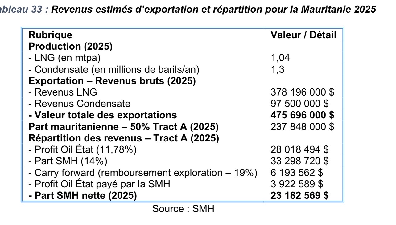 Des données officielles publiées par la Société mauritanienne des hydrocarbures (SMH) révèlent que la valeur totale des exportations du projet gazier “Greater Tortue Ahmeyim” (GTA) atteindra environ 475,7 millions USD au cours de la première année de production commerciale, en 2025, dont 378,2 millions USD provenant du gaz naturel liquéfié