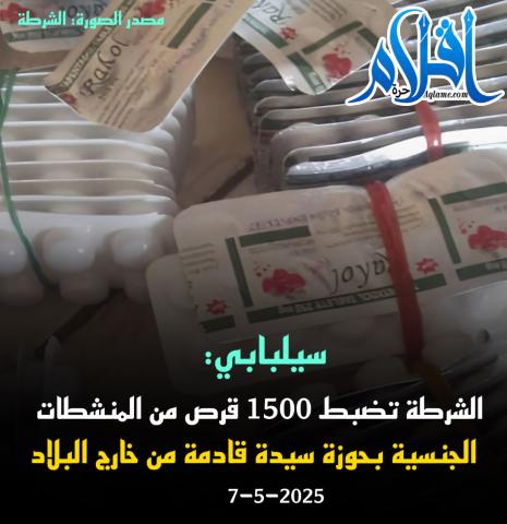 أعلنت الشرطة الموريتانية عن تمكن فرقها اليوم الأربعاء من ضبط كمية من الأقراص المنشطة جنسيا، تبلغ 150 شريحة وكل شريحة بها 10 أقراص. بحوزة سيدة قادمة من دولة أجنبية، تدعى: ا - م - انجاي مولودة 1985 في داكار. وذلك أثناء التفتيش الروتيني للركاب المسافرين من محطة النقل بسيلبابي، ولاية كيديماغا.
