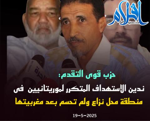 قال حزب اتحاد قوى التقدم، إنه تلقى بأسى بالغ نبأ مقتل موريتانيين اثنين على الأقل، إثر قصف نفذته طائرة مسيرة مغربية يوم الجمعة 16 مايو 2025 في المنطقة الحدودية مع الصحراء الغربية، مستنكرا تكرار هذه العمليات التي تستهدف مدنيين عزل.