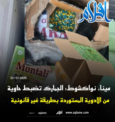 تمكن مكتب الجمارك بميناء نواكشوط خلال شهر مايو 2025 من حجز كميات من الأدوية المهربة داخل حاويات قادمة الي الميناء من مناطق مختلفة، حيث استطاعت فرق التفتيش الجمركي من ضبط و حجز هذ الأدوية التي كان ينوي أصحابها إدخالها بطريقة غير شرعية و في ظروف نقل لا تتماشى مع المعايير الصحية المتبعة في نقل واستيراد الأدوية.