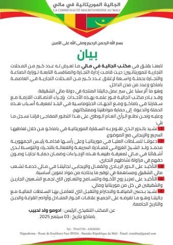 وقال المكتب في بيان أصدره اليوم 3 سبتمبر 2025 إن ما جرى يمسّ سير عمل الجالية المنتجة في مالي، مشيرًا إلى أنه بادر فور علمه بالموضوع إلى إجراء اتصالات مع السفارة الموريتانية والجهات الدبلوماسية لمعرفة أسباب الحملة والدعوة إلى حماية المواطنين وممتلكاتهم.