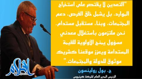 “إن التعدين لا يقتصر على استخراج الموارد الطبيعية فحسب، بل يشمل كذلك خلق الفرص الاقتصادية، ودعم المجتمعات المحلية، والمساهمة في بناء مستقبل مستدام. نحن في كينروس نؤكد التزامنا بممارسة استغلال معدني مسؤول، يمنح الأولوية لإيجاد قيمة مستدامة، ويعزز موقعنا كشريك موثوق لكل من الدولة والمجتمعات.”