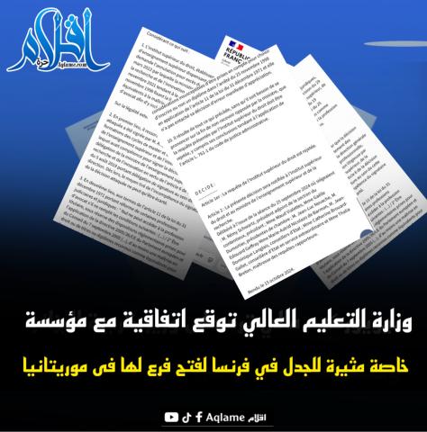وقّعت وزارة التعليم العالي والبحث العلمي في موريتانيا، يوم أمس، اتفاقية مع المعهد العالي للقانون في فرنسا لفتح فرع له في البلاد، وذلك في إطار سعيها لتوسيع العرض الجامعي في التخصصات القانونية وتوفير فرص جديدة للتكوين أمام الطلبة الموريتانيين.