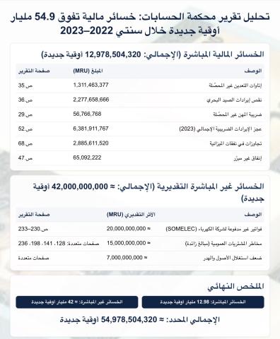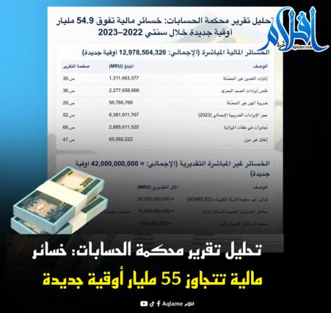 كشف تقرير محكمة الحسابات عن تسجيل خسائر مالية مباشرة وغير مباشرة تُقدّر بنحو 55 مليار أوقية جديدة (MRU) خلال الفترة الممتدة بين عامي 2022 و2023، نتيجة اختلالات في تحصيل الإيرادات وتنفيذ النفقات وتسيير الأصول العمومية.