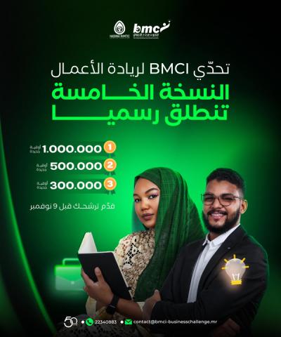 أعلن BMCI عن الإطلاق الرسمي للنسخة الخامسة من تحدي BMCI للأعمال 2025، المبادرة الرائدة التي تهدف إلى مواكبة الشباب الموريتانيين أصحاب المشاريع المبتكرة ودعمهم لتحويل أفكاركهم إلى قصص نجاح ملهمة ومؤثرة.