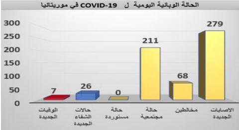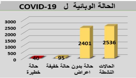 أعلنت وزارة الصحة تسجيل 277 حالة إصابة جديدة و 7 وفيات و26 حالة شفاء، كما ارتفع عدد الحالات الحرجة من 35 يوم امس الي 40 حالة اليوم