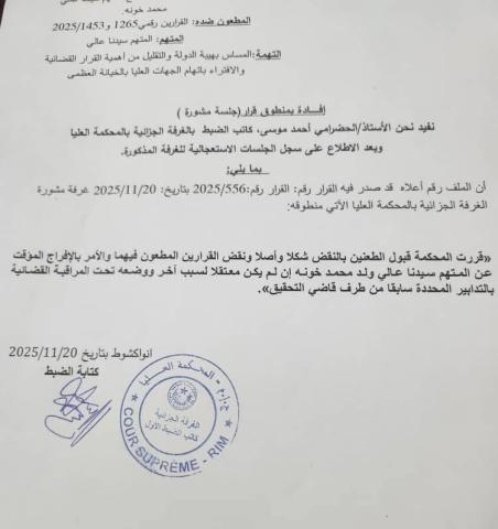 أمرت الغرفة الجزائية بالمحكمة العليا، اليوم، بالإفراج المؤقت عن سيدنا عالي ولد محمد خونه، بعد نظرها في الملف المعروض أمامها. ويأتي القرار في إطار المسار القضائي المتعلق بالقضية، وسط انتظار لاستكمال بقية الإجراءات القانونية المعتمدة