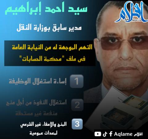 التهم الموجهة للمدير السابق للبنى التحتية بوزارة النقل سيدي احمد ولد إبراهيم فى اطار التحقيقات في ملف تقرير محكمة الحسابات.