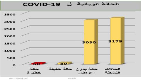 وحسب النشرة اليومية لوزارة الصحة فقد وصل عدد حالات الإصابة النشطة إلى 3179، من بينها 3030 إصابة بدون أعراض، و89 حالة خفيفة، و60 حالة خطيرة.