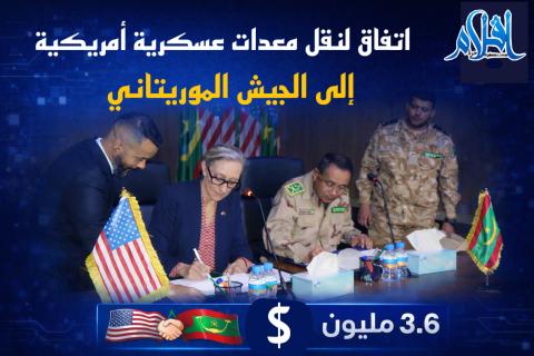 وقّعت القائمة بالأعمال بالإنابة لدى السفارة الأمريكية في نواكشوط، كورينا آر. ساندرز، وقائد الأركان العامة للجيوش الموريتانية، الفريق محمد ولد الرايس، اتفاقيةً تقضي بنقل معدات عسكرية أمريكية إلى القوات المسلحة الموريتانية، بقيمة 3.6 ملايين دولار.