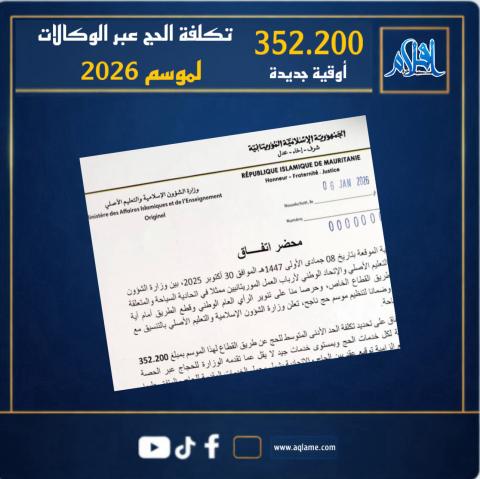 أعلنت وزارة الشؤون الإسلامية والتعليم الأصلي، بالتنسيق مع اتحادية السياحة التابعة للاتحاد الوطني لأرباب العمل الموريتانيين، تحديد مبلغ 352,200 أوقية كحدٍّ أدنى متوسط لتكلفة حج الفرد عبر وكالات القطاع الخاص لموسم 2026م، مع اشتراط أن تكون الخدمات المقدمة في هذا الإطار بمستوى لا يقل عن تلك المعتمدة ضمن الحصة الرسمية.