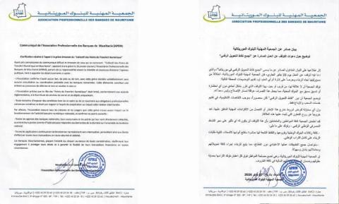نفت الجمعية المهنية لبنوك موريتانيا (APBM) أي علاقة لها بالدعوة إلى الإضراب التي أعلن عنها ما يُعرف بـتجمع نقاط التحويل الرقمي، والمقرر تنظيمها يوم 28 يناير الجاري، مؤكدة أن هذا التحرك تم دون تنسيق مع القطاع المصرفي.