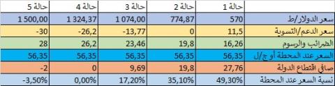لقد سعينا من أجل توضيح النسب المتغيرة و الثابتة إلى حساب قيمة هذه العناصر عند 5 مستويات مختلفة لسعر البرميل الدولي من الديزل ( أنظر الجدول ):