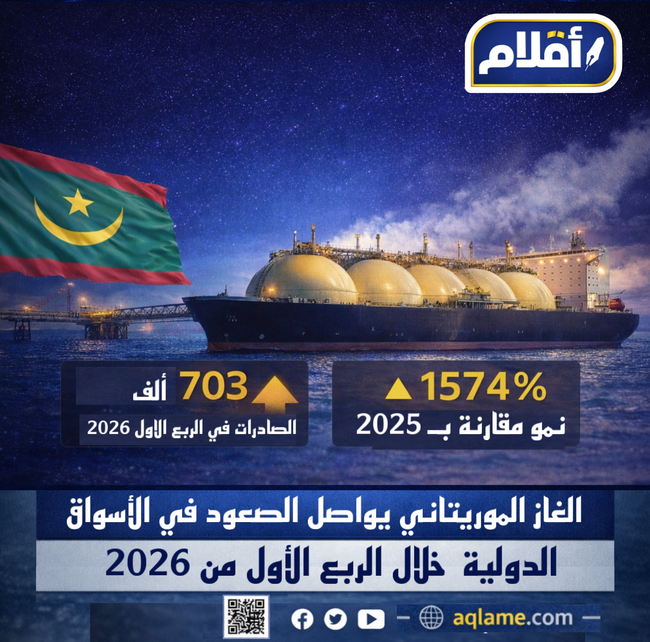 أفادت منصة الطاقة العالمية بأن صادرات موريتانيا من الغاز الطبيعي المسال سجلت ارتفاعًا كبيرًا خلال الربع الأول من عام 2026، بعدما بلغت نحو 703 آلاف طن، مقابل 42 ألف طن فقط خلال الفترة نفسها من عام 2025، أي بزيادة تقارب 16 ضعفًا.