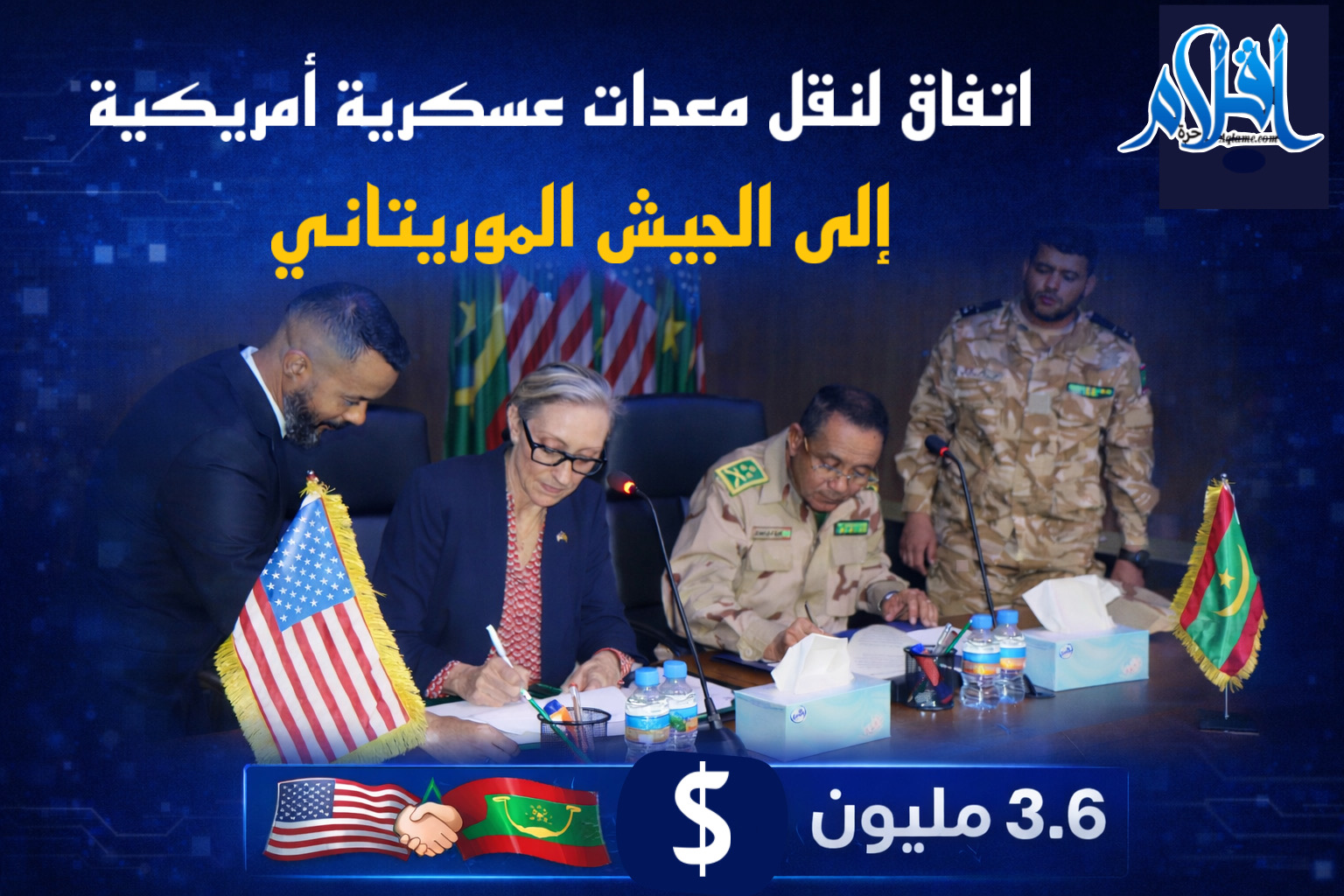 وقّعت القائمة بالأعمال بالإنابة لدى السفارة الأمريكية في نواكشوط، كورينا آر. ساندرز، وقائد الأركان العامة للجيوش الموريتانية، الفريق محمد ولد الرايس، اتفاقيةً تقضي بنقل معدات عسكرية أمريكية إلى القوات المسلحة الموريتانية، بقيمة 3.6 ملايين دولار.