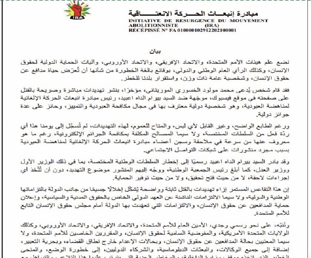 أفادت حركة «إيرا» بأن رئيسها، بيرام الداه اعبيد، تعرّض لتهديد بالقتل عبر منشور على موقع فيسبوك، معتبرة أن السلطات لم تتخذ أي إجراء حيال الواقعة حتى الآن.