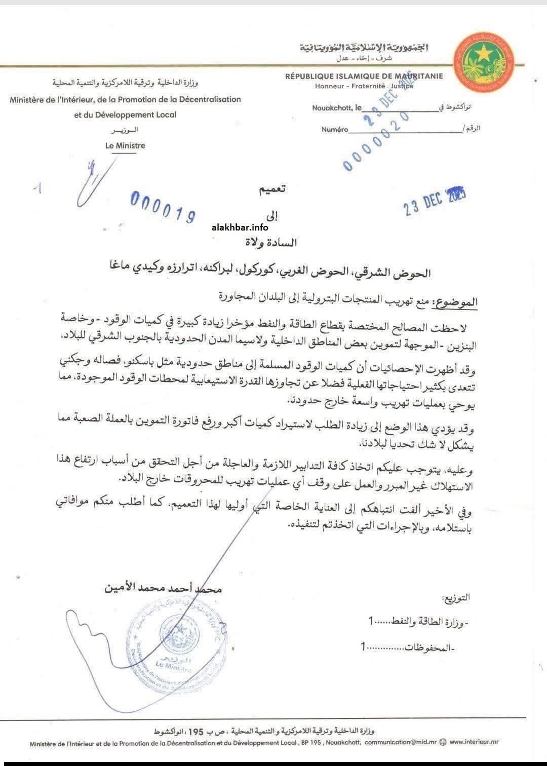 وجّه وزير الداخلية وترقية اللامركزية والتنمية المحلية، محمد أحمد ولد محمد الأمين، تعليمات إلى ولاة الولايات الجنوبية والشرقية، دعاهم فيها إلى تشديد الرقابة واتخاذ الإجراءات اللازمة لمنع تهريب المحروقات إلى خارج البلاد.