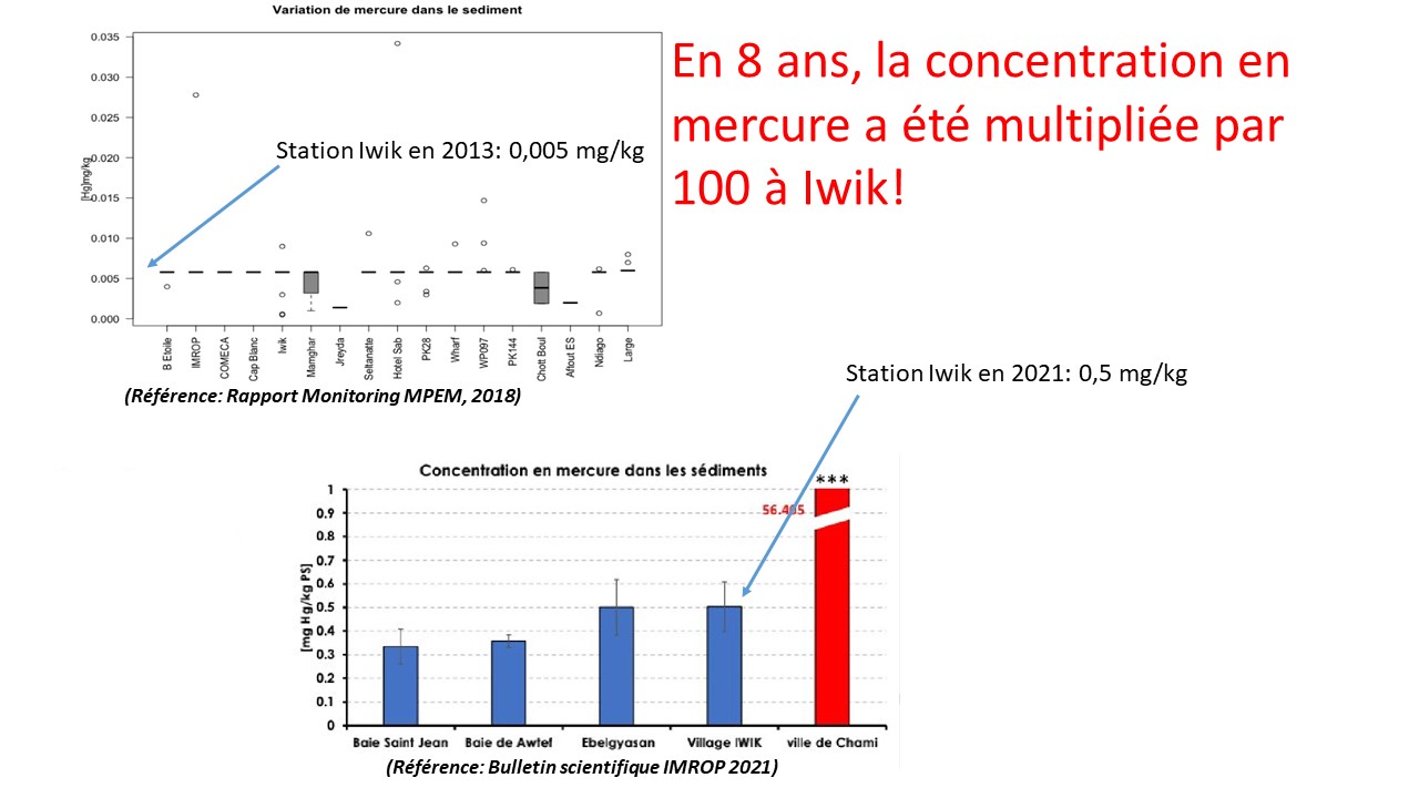 1. La concentration du mercure à Chami (prise dans le site d’extraction) atteint une valeur vertigineuse de 56,4 mg(Hg)/kg. Le site de Chami jouxtant le PNBA, la valeur référence de sa concentration en mercure doit être proche de celle d’Iwik, qui était de 0.005 mg(Hg)/kg. Ce qui correspond à une multiplication par 11000 de la concentration du mercure dans cette nouvelle ville.
