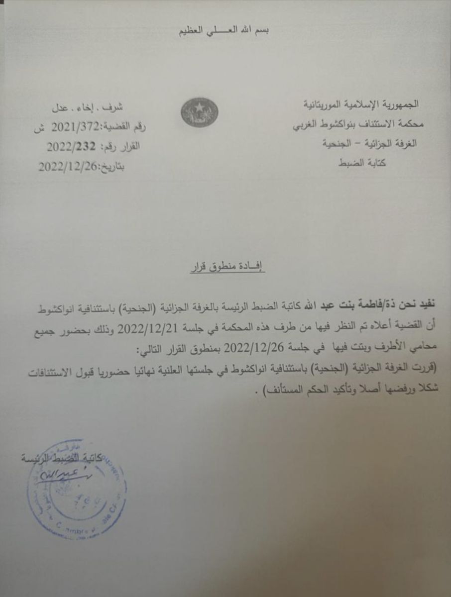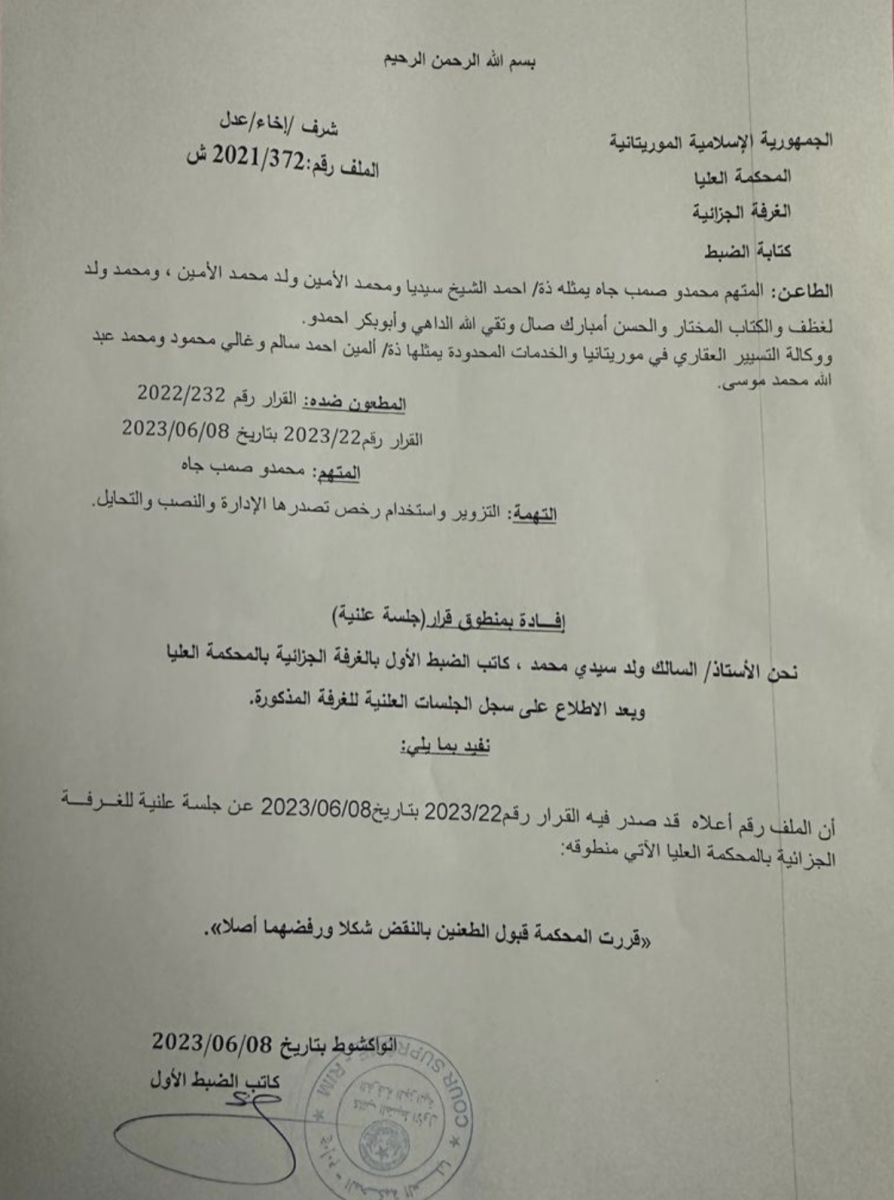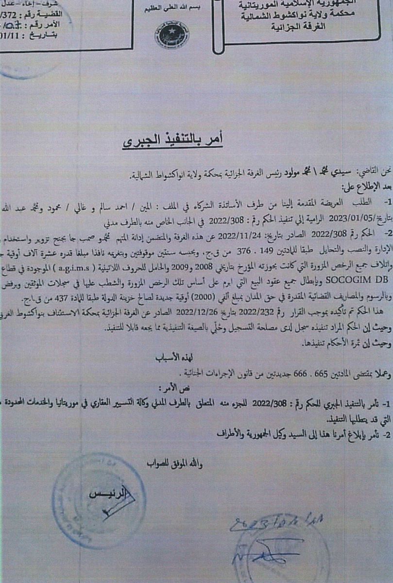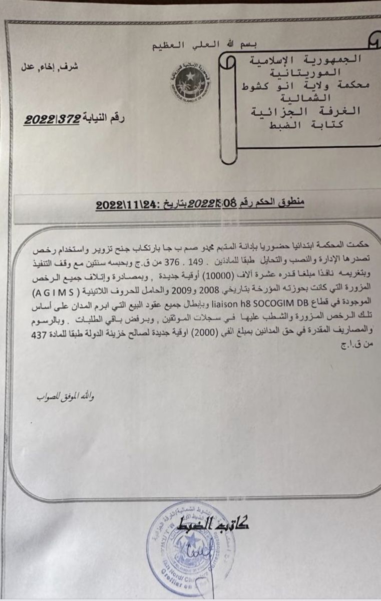 أصدرت المحكمة الابتدائية في نواكشوط الشمالية حكمها رقم: 308/2022، بالسجن لمدة سنتين غير نافذتين ضد المتهم محمدو صامبا ديا بتهمة التزوير والنصب والتحايل. وبمصادرة وإتلاف جميع الرخص المزورة التي كانت بحوزته المؤرخة بتاريخ 2009/2008 والحاملة للأحرف اللاتينية AGIMS الموجودة في قطاع تيارت LAIASON H8 SOCOGIM DB، وبإبطال جميع عقود البيع التي أبرم محمدو صامبا ديا على أساس تلك الرخص المزورة، والشطب عليها في سجلات الموثقين، واستأنف صامبا ديا الحكم المذكور وأكدته محكمة الاستئناف فقام بالطعن في قرار محكمة الاستئناف الذي أكدته المحكة العليا بصفة نهائية في يونيو 2023، وقد حصلت AGIMS على التنفيذ الجبري لمضمون الحكم 308/2022، المؤكد من طرف محكمة الاستئناف والمحكمة العليا وذلك بموجب الأمر رقم:07/2023 بتاريخ: 11/01/2023.