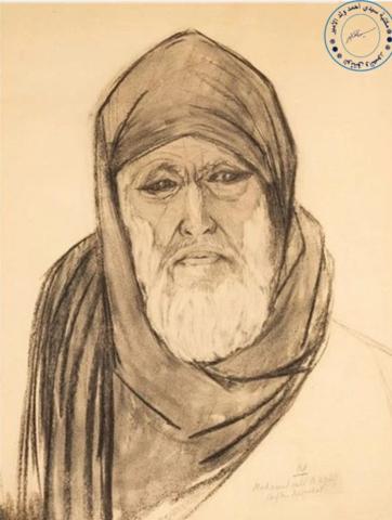 وتأتي العمامة لتُغطي الرأس وقد انسدلت بخفة حول الكتفين في خطوط انسيابية، متوازنة بين الظل والنور، مما يضفي على الرسم إحساساً بالسكينة والسمو. أما اللحية البيضاء الكثيفة فهي تكمّل ملامح الوجه وتؤكد انطباع الوقار والرصانة. والألوان الأحادية بالأسود والرمادي منحت العمل طابعاً كلاسيكياً، وجعلت التركيز منصبًّا على التعبير الداخلي أكثر من المظاهر الخارجية.