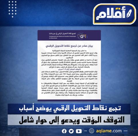 اصدر تجمع نقاط التحويل الرقمي فى موريتانيا بيانًا توضيحيًا ردًّا على ما ورد في بيان الجمعية المهنية للبنوك الموريتانية، أكد فيه أن التحركات الأخيرة للتجمع جاءت على خلفية إجراءات ضريبية جديدة اعتبر أنها أُقرت دون تشاور مسبق مع الفاعلين المباشرين في القطاع.