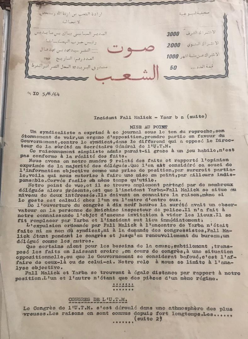 وفِي تلك الفترة كانت عندنا دورية اخري يصدرها ويحررها الأخ الأديب والشاعر محمدن إشدو بعنوان "موريانيا الفتاة" وهي تحض علي الاتجاه القومي العربي. وأتذكر انني ذهبت ذات ليلة من ليالي الصيف رفقة محمدن ولد إشدو اطال الله بقاءه، الي دار مبنية من الطين ، مغطاة بصفائح الزنك متواضعة المنظر ، عظيمةٍ مهيبة بساكنها، انه المناضل الشهم الوزير والقائد الملهم بياكي ولد عابدين. دخلنا الدار وكان بابها مفتوحاً لكل طارق، فاستقبنا الزعيم بياكي وبعد تبادل التحية مع الرجل الذي يفيض وقاراً وشجاعةً، اخبرنا ان المكان تعرض في الليلة السابقة لتخريب من طرف أنصار نظام الاستعمار الجديد وأنهم سرقوا كبريات آلات الطباعة والسحب الموجودة فى المكان وكان يصدر بها مجلة "صوت الشعب" التي كان ينتقد فيها انتقاداً لاذعاً ارتباط البلاد بالمستعمر السابق، بأسلوب وطني صادقٍ ومخلص. وأردف الزعيم بياكى ول عابدين رحمه الله وطيب ثراه متهكماً ساخراً من النظام القائم: "هم لا يدركون انه باستطاعتي ان أعوض ما اتلفوه وسرقوه في لمح البصر ومن ثمن نعاجي البيض حصرا!".
