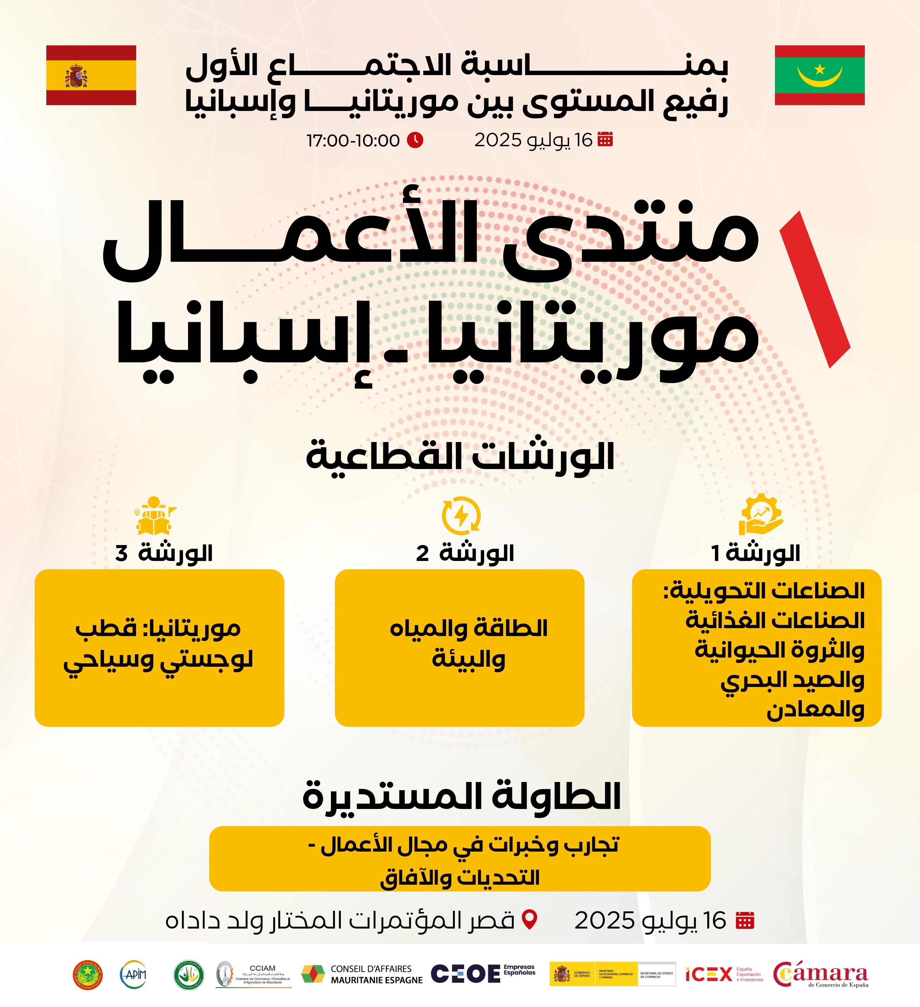 بمناسبة الاجتماع الأول رفيع المستوى بين موريتانيا وإسبانيا، سينعقد منتدى الأعمال الموريتاني الإسباني يوم 16 يوليو 2025، الساعة 10:30 صباحًا، في قصر المؤتمرات " المختار ولد داداه " في نواكشوط.