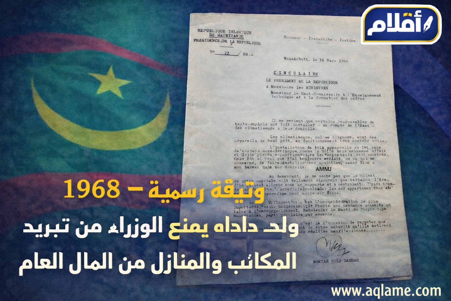 كشفت وثيقة رسمية مؤرخة بتاريخ 16 مارس 1968 عن تعميم صادر عن أول رئيس لموريتانيا، المختار ولد داداه، يرفض فيه بشكل قاطع قيام مسؤولين حكوميين بتركيب أجهزة تكييف في منازلهم على نفقة الدولة.