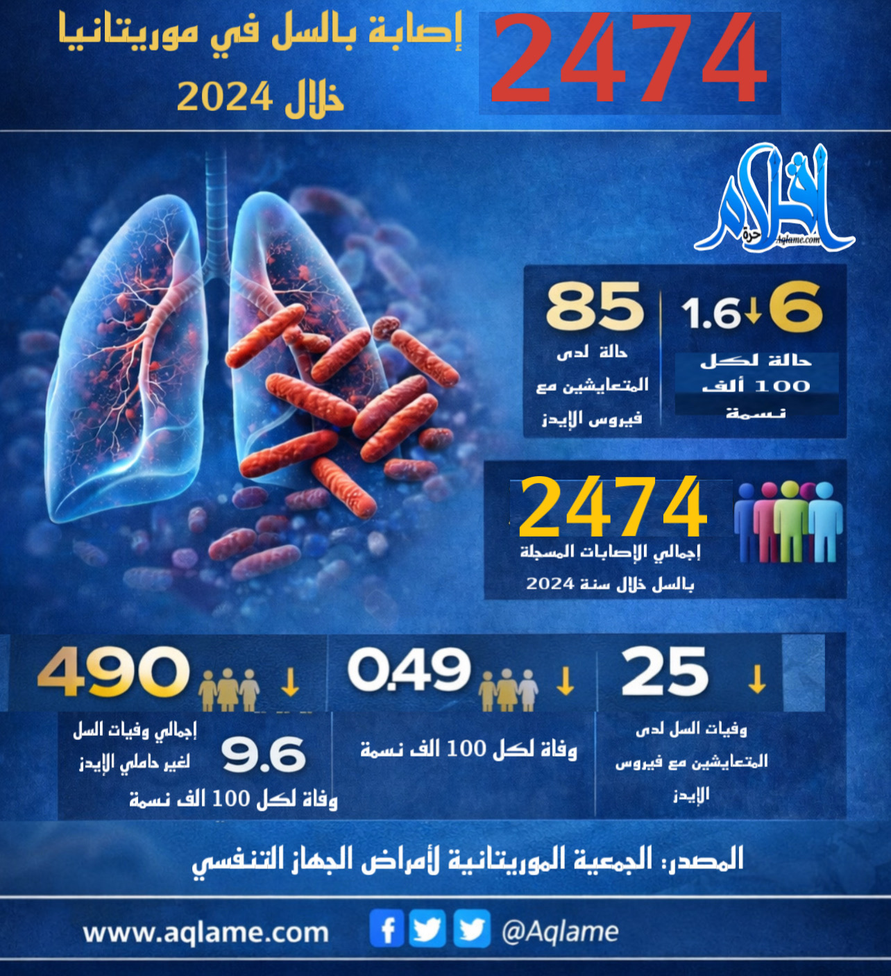 كشف الدكتور عينينا ولد أحمد الهادي، اخصائي أمراض الصدر ورئيس الجمعية الموريتانية لأمراض الجهاز التنفسي، عن تسجيل نحو 2474 حالة إصابة بمرض السل الرئوي فى موريتانيا خلال سنة 2024، أي بمعدل يناهز 46 حالة لكل 100 ألف نسمة.